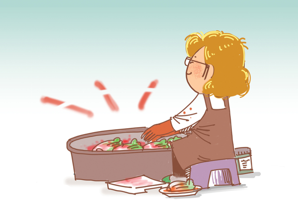 커다란 대야에 양념을 버무린다. 미리 고춧가루를 뿌려 붉게 물들여놓은 무채 위에 준비해둔 갖은 양념들을 넣고 고춧가루를 푸짐하게 쏟은 다음 꿀을 둥글게 둥글게 뿌려주었다. 이제 활활 젓는 일만 남았다. 십수 번 맨손으로 이리 뒤집고 저리 뒤집으며 양념을 골고루 섞는다.
