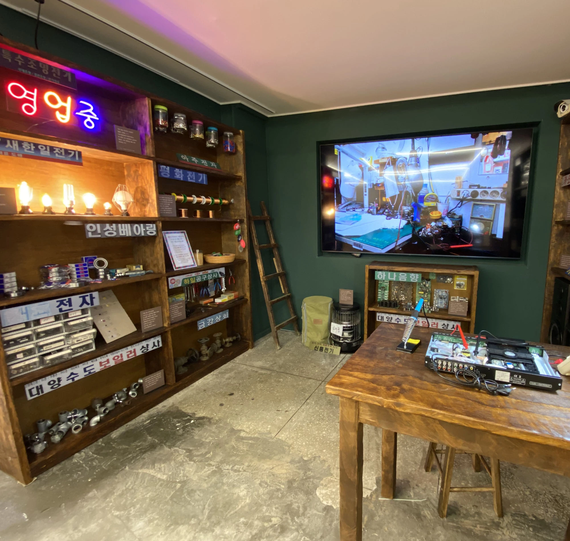 서점 안 전시 공간에는 ‘일심특수조명전기’ ‘아주전자’ ‘새한일전기’ ‘인성베아링’ ‘하나음향’ ‘동원전자’ 등 동인천 전자상가의 가게들을 재현했습니다. 그 가게에서 무엇을 팔고 있으며 어떤 이야기가 깃들어 있는지 볼 수 있습니다.