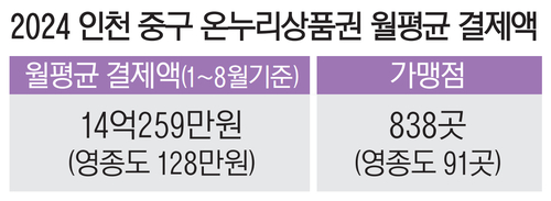 인천지역 온누리상품권 월평균 결제액을 살펴보면 중구에서는 지난해(1~8월) 월평균 14억259만원이 쓰였는데, 이 중 영종도에서 쓰인 금액은 월평균 128만원에 불과하다. 2023년(1~12월) 기준 중구 전체 월평균 결제액(12억7천303만원) 중 영종도에서는 월평균 61만원이 쓰이는 데 그쳤다.