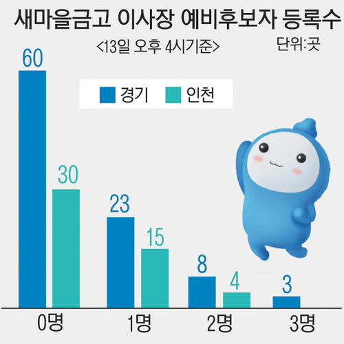 인천시는 이 시각까지 23명이 예비후보로 이름을 올렸다. 가장 많은 예비 후보가 등록한 곳은 부평구의 부일새마을금고, 산곡새마을금고, 신성새마을금고와 서구의 서해새마을금고로 각각 2명씩의 예비후보들이 경쟁 상대로 나섰다.