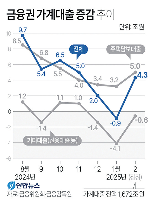 12일 금융위원회와 금융감독원이 공개한 ‘가계대출 동향’에 따르면 금융권 전체 2월 가계대출 잔액은 1천672조원으로 전월보다 4조3천억원 증가했다. 지난 1월 10개월 만에 9천억원 줄었다가 한달 만에 도로 상승했다.