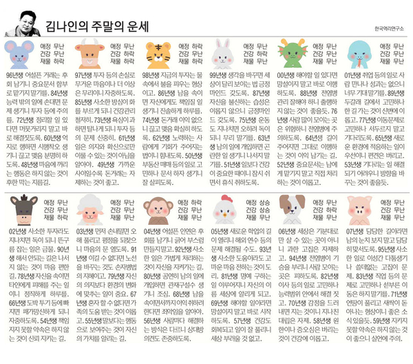子(쥐띠)=96년 어설픈 거래는 후회를 남기니 중요문서 함부로 맡기지 말기를 84년 능력 밖의 일에 손대면 금융문제로 이어지니 투자 등에 주의를 72년 정리할일 있다면 머뭇거리지 말고 바로 해결 짓도록 60년 억지로 행하면 시행착오 생기니 끊고 맺음 분명히 하도록 48년 마음에 꺼리는 행동은 하지 않는 것이 후한 막는 지름길