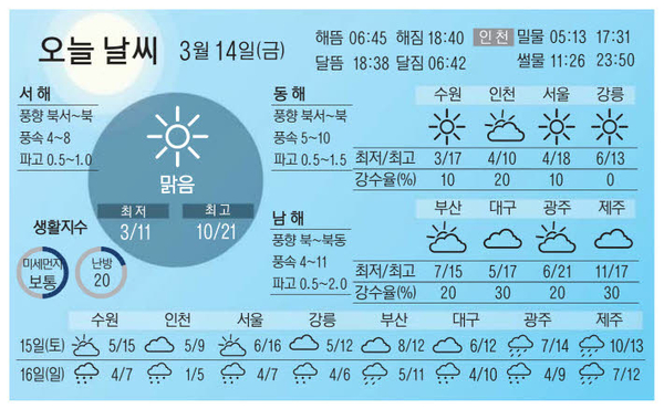사회 기후·환경 [주말 날씨] 3월 14일 금요일-3월 16일 일요일 입력 2025-03-13 20:27 지면 아이콘 지면 ⓘ 2025-03-14 2면 북마크 공유하기 공유 페이스북 카카오톡 밴드 트위터 URL복사 프린트 가 글자크기 설정 글자크기 설정 시 다른 기사의 본문도 동일하게 적용됩니다. 가 가 가 가 가 경인일보 Copyright ⓒ kyeongin.com 0 0