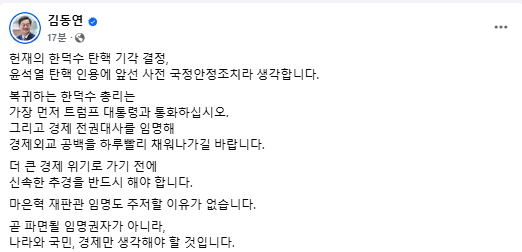 김 지사는 24일 오전 한 총리 탄핵심판 기각이 결정된 직후 자신의 SNS를 통해 한 총리를 향해 “곧 파면될 임명권자가 아니라 나라와 국민, 경제만 생각해야 할 것”이라며 경제 조치 등을 당부했다.