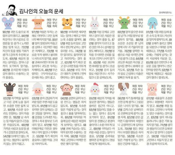 申(원숭이띠)=04년 공연히 긁어 부스럼 만드는 행동은 하지 않는 것이 마음편한 길 92년 사소한 일은 가볍게 넘기는 것이 좋으니 훌훌 털어버리도록 80년 어지러운 마음에 담은 세상은 복잡하게 보여지는 법이고 68년 귀에 거슬리는 말도 약이 된다면 수용하는 것이 지혜 56년 이성문제로 고민하나 어색한 인연은 맺지 말기를