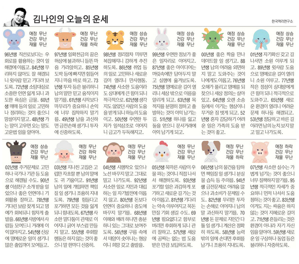 子(쥐띠)=96년 직선로 보다는 우회로를 활용하는 것이 일 해결에 이롭고 84년 무리하지 않아도 잘 해결되니 윗사람 믿고 기다려 보도록 72년 소탐대실로 소중한 인연 잃게 되니 과도한 욕심은 자제하도록 60년 매매 등의 일로 고민하나 정리하는 것이 좋으니 망설이지 말고 48년 가는 말이 고우면 오는 말도 고운 법임을 알아야