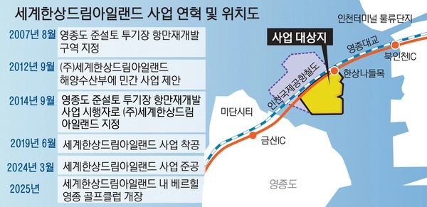 2014년 9월 해수부가 세계한상드림아일랜드를 사업 시행자로 지정했으나, 수차례 개발계획이 변경되면서 2019년 6월이 돼서야 공사가 시작됐다. 연간 관광객 500만명이 찾는 워터파크, 특급호텔, 콘도, 복합쇼핑몰, 마리나 리조트, 테마공원, 골프장 등을 조성하는 게 사업 내용이다. 지난해 3월 기반 공사가 마무리됐지만 골프장을 제외한 나머지 사업은 시작조차 못한 상태다. 부동산 경기와 내수 침체가 장기화하면서 토지를 매입해 사업을 벌일 투자자를 찾지 못하고 있기 때문이다.