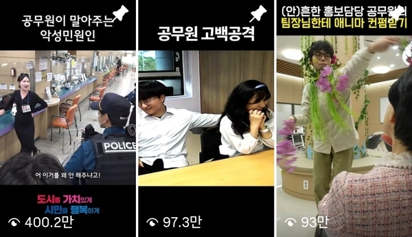 유튜브와 인스타 등 시 공식 SNS를 총괄 운영하는 홍보실 뉴미디어팀에는 열정으론 둘째 가라면 서러울 4명의 공직자들이 포진돼 있다. 남다른 팀워크를 바탕으로 똘똘 뭉친 이들은 트렌드에 맞는 SNS를 기획·제작해 자칫 딱딱할 수 있는 시정 홍보를 유연하게 풀어낸다. 시정 소식을 알린다는 기본 틀은 유지하면서 다양하고 참신한 시도를 곁들이며 시민들의 흥미를 이끌어내고 있다. 악성민원인 릴스 외에도 ‘공무원 고백공격(97만뷰)’, ‘애니마 컨펌받기(93만뷰)’ 등의 게시물도 100만뷰에 육박했다.