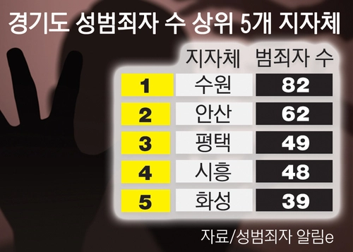 통계 세부사항을 들여다보면 대체로 인구 수를 따라가는 가운데서도 유독 많은 성범죄자 거주 지자체가 눈에 띈다. 수원시의 성범죄자 수는 82명으로 가장 많았고 뒤이어 안산시(62명), 평택시(49명), 시흥시(48명), 화성시(39명)가 상위권을 기록했다.