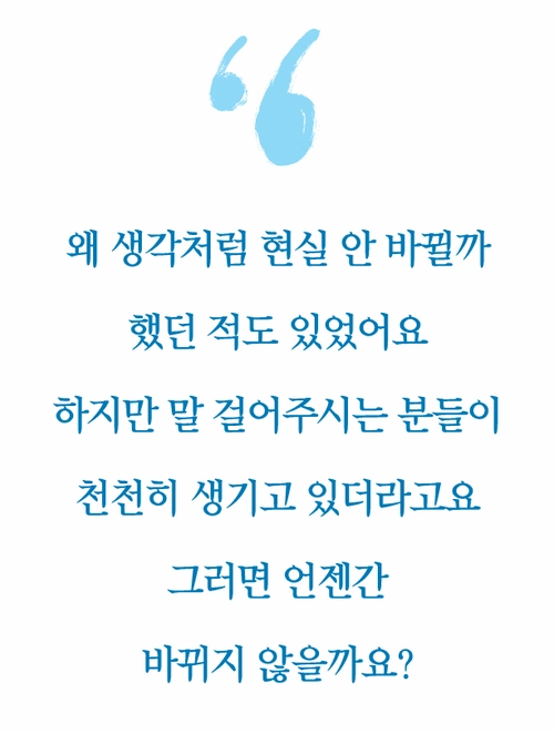 “왜 이렇게 생각처럼 빨리 안바뀔까 했던 적도 있었어요. 하지만 ‘뭐가 문제인 것 같아?’ ‘어느 방향으로 가는 게 좋은 것 같아?’라며 말을 걸어주시는 분들이 천천히라도 생기고 있더라구요. 그러면 언젠간 바뀌지 않을까요?”