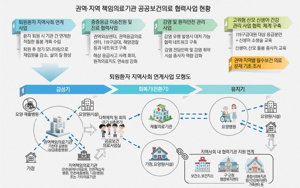 전국 72개 권역·지역책임의료기관은 보건복지부 정책의 일환으로 ‘퇴원환자 지역사회 연계사업’을 펴고 있다. 이 사업은 암, 급성기 치료 예방, 합병증 관리의 중요성이 높은 뇌혈관 질환 등에 해당하는 환자들을 대상으로 한다. 그중에서 가정형편 등이 어려운 환자가 퇴원 후에도 원활한 삶을 유지할 수 있도록 지역사회가 함께 다각적인 지원책을 마련하는 것이 골자다. 환자가 퇴원 후 집이나 재활기관, 요양기관 등 복귀 유형에 따라 병·의원, 보건소 등 지역 유관기관들이 협력해 맞춤형 지원을 하게 된다.