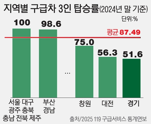 특히 구급대원의 인력 부족은 심각한 수준이다. 소방청은 과중한 업무를 줄이기 위해 구급차 1대당 전문 응급대원 2명과 운전원 1명이 탑승하는 ‘3인 체제’ 운영을 권고하고 있지만, 현장에선 지켜지지 않은 지 오래다. 2025년 119구급서비스 통계연보를 보면 지난해 기준 도내 구급차 3인 탑승률은 51.6%로, 전국 평균(87.49%)에 한참 미치지 못하고 있다.
