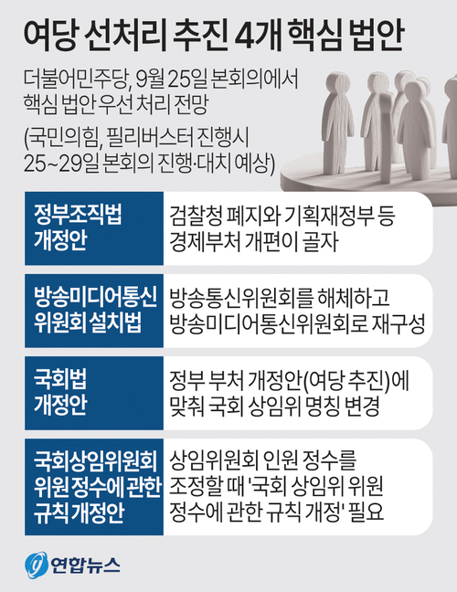 더불어민주당이 25일 본회의에서 정부조직법을 비롯한 4개 핵심 법안만 우선 처리하기로 방침을 정했다. 그러나 국민의힘이 모든 안건에 대해 필리버스터(무제한 토론을 통한 합법적 의사진행 방해)를 예고한 데 따른 대응책이다.