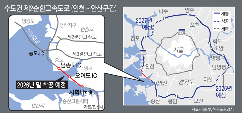 24일 국토교통부에 따르면 수도권 제2순환선 인천~안산 노선에 포함돼 있는 1구간인 시화나래IC∼남송도IC(8.4㎞) 도로가 이르면 내년 말 착공한다. 현재 공사 시작을 위한 설계, 기획재정부 협의 절차가 동시에 진행되고 있다.