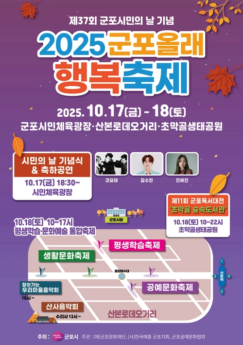 시는 시민의 날을 기념해 매년 시민을 위한 다양한 축제와 행사를 개최해 왔다. 올해는 시민의 날이 추석 연휴에 포함돼 있어 연휴가 끝난 뒤 잇따라 행사가 펼쳐진다. 특히 가을에 개별적으로 열렸던 다양한 축제를 ‘군포올래행복축제’로 통합, 오는 17~18일 이틀 간 군포 전역에서 축제 한마당이 펼쳐질 전망이다.
