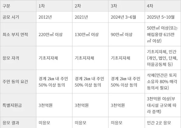 앞서 4자협의체는 2012년, 2021년, 지난해 등 세 차례에 걸쳐 입지 후보지를 찾는 공모를 진행했지만 유찰됐다. 이에 따라 이번 공모에선 기초지방자치단체만 신청할 수 있었던 응모 자격을 민간까지 확대하고, ‘주변 주민 50% 이상 사전 동의’ 요건을 삭제하는 등 기준을 대폭 낮췄다.