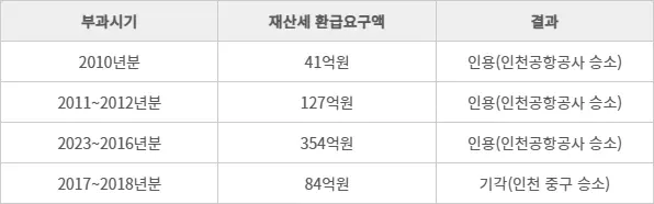 인천공항공사는 2010~2012년도분 재산세 부과에 대해 중구와 인천시에 부당이득반환청구 소송을 진행했다. 1심에서는 공사가 패소했으나 2심에서 결과가 뒤집혔고 대법까지 가 공사가 최종 승소했다. 이때 공사가 받아낸 재산세는 2010년분 41억원, 2011~2012년도분 127억원에 달한다. 또 공사는 2013~2016년도분 재산세에 대해서도 소송을 통해 354억원을 환급받았다.