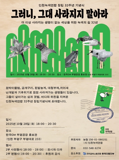 1993년 ‘인천배달환경’이라는 이름으로 시작해 1996년 재창립한 인천녹색연합은 지난 32년간 점박이물범, 흰발농게, 대청부채 등 인천에 살고 있는 여러 생물종을 지켜왔다. 이들의 노력은 이 생물들이 멸종하지 않고 인천 시민들과 더불어 살아가는 데 도움이 됐다. 오는 28일 창립 32주년 기념행사를 앞둔 인천녹색연합은 인천에 살고 있는 모든 생물들에게 당부한다. “그러니 그대, 사라지지 말아라….”
