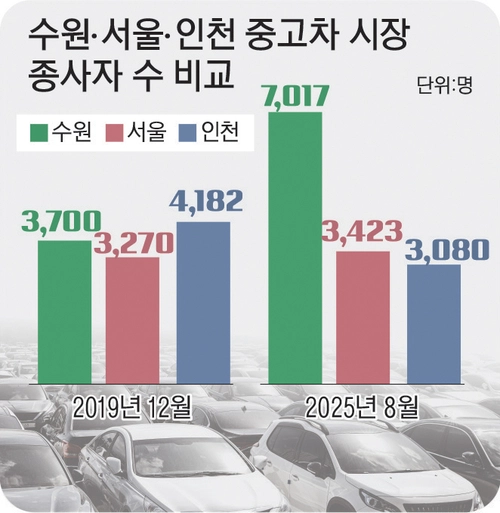 지난 2019년 12월 기준 수원의 중고차 종사자는 3천700명에 불과했지만 지난 8월 기준으로 7천명 수준으로 90% 가까이 늘었고, 같은 기간 서울 종사자는 단 4.5% 늘었으며 4천182명이 일하던 인천은 3천80명으로 -26.3%가 급감했다. 같은 시기의 수원 소재 상사 수도 56.1%(187개→292개) 늘었다.