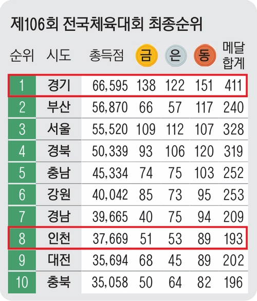 도는 23일 부산시에서 막을 내린 이번 체전에서 금메달 138개, 은메달 122개, 동메달 151개 등 총 411개의 메달을 획득하며 종합점수 6만6천595점을 기록, 2위권과의 격차를 9천700여점차로 벌리며 완벽한 우승을 거뒀다.