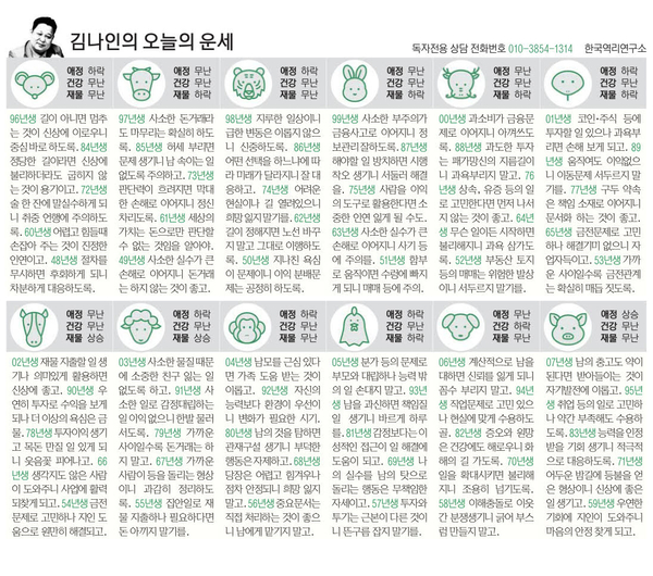 未(양띠)=03년 사소한 물질 때문에 소중한 친구 잃는 일 없도록 마음 바로하고 91년 사소한 일로 감정 대립하는 일 이익 없으니 한발 물러서도록 79년 가까운 사이일수록 돈거래는 하지 않는 것이 좋을 듯 67년 가까운 사람이 등을 돌리는 형상이니 과감히 정리하도록 55년 집안일로 재물 지출하나 필요하다면 돈 아끼지 말기를