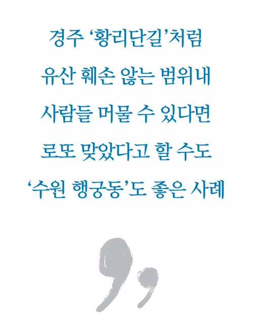 꼭 옛것만 고집해야 한다는 것은 아니라는 것이다. 신 교수는 “각각의 도시의 특색을 살릴 수 있는 것들을 만들어 가야 한다면 문화유산은 만들어야 하는 존재가 아닌, 이미 만들어져 있는 존재이다. 그러니 그걸 이용하면 된다. 고민 자체를 다른 쪽으로 하면 더 쉽게 풀릴 수 있는 문제”라고 했다.