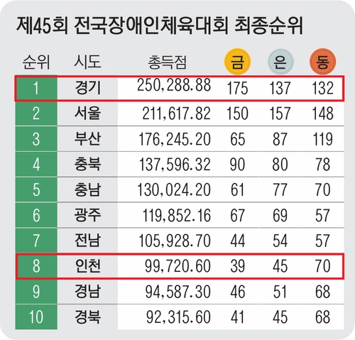 경기도가 제45회 전국장애인체육대회에서 종합우승 5연패와 함께 통산 25번째 우승컵의 금자탑을 쌓았다.
