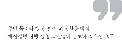 의회 본연의 견제와 감시 역할에도 소홀함이 없다. 이 의원은 “지난해 시 재정자립도는 39.8%로 효율적인 예산 집행이 절실하다”며 “비용 대비 효과 분석 없이 이어지는 대규모 위탁사업, 방치되는 기금 등을 면밀히 검토하고 개선을 요구하고 있다”고 이야기했다.