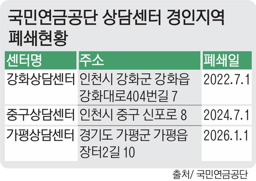국민연금공단 등에 따르면 가평상담센터는 2026년 1월 1일자로 폐쇄될 예정이다. 공단은 지난 2022년 7월부터 전국 39개 상담센터 중 16곳을 이미 폐쇄했다. 이 중에는 인천 강화상담센터와 중구상담센터도 포함돼 있다. 가평상담센터까지 사라질 경우 전체 상담센터의 43.6%가 문을 닫게 된다.
