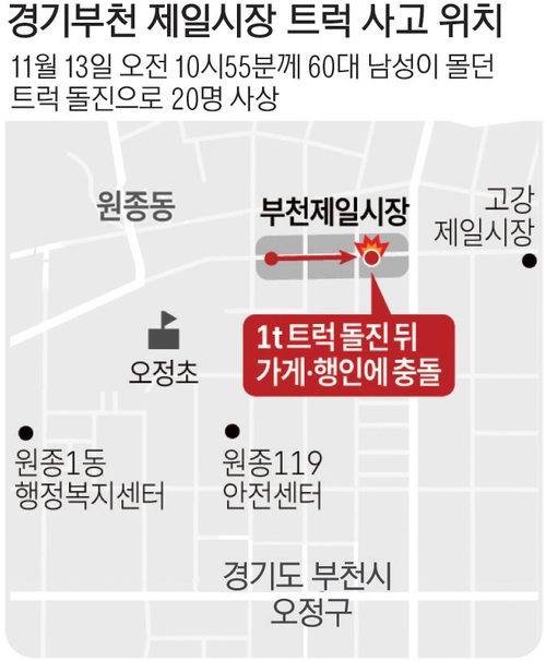 13일 오후 2시께 부천시 오정구 원종동 제일시장에서 만난 분식가게 상인 김경미(54)씨는 트럭 돌진 사고 상황을 묻자 이렇게 전했다. 그는 “큰 소리가 들린 지 몇 초 지나지 않아 트럭이 눈앞을 스쳐 지나가더니 속옷가게 기둥을 들이받고서야 멈췄다”며 “식사 중이던 손님 한 분도 다쳤는데, 너무 놀라 오늘은 장사를 아예 접었다”고 말했다. 이날 오전 10시 55분께 제일시장에서는 60대 후반 A씨가 몰던 1톤 트럭이 상가로 돌진해 20명의 사상자가 발생했다.
