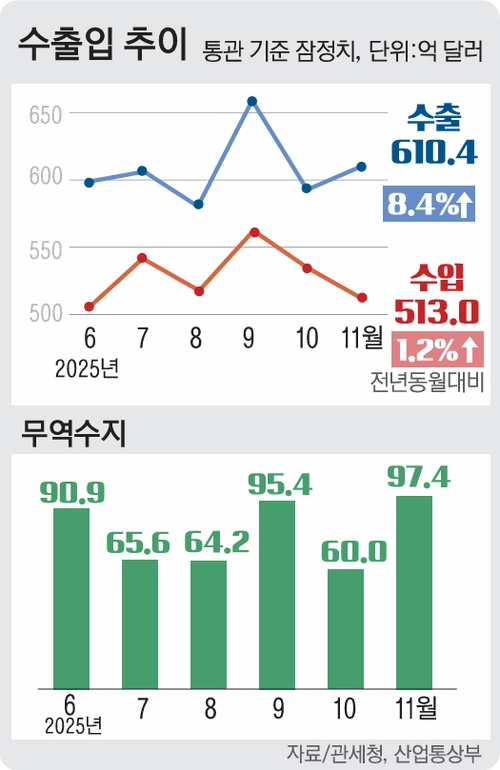 1일 산업통상부에 따르면 11월 한국 수출은 전년 대비 8.4% 증가한 610억4천만달러로 역대 11월 중 최대 기록을 세웠다. 특히 반도체는 전년대비 38.6%, 자동차는 13.7% 증가하며 무역흑자를 견인했다.