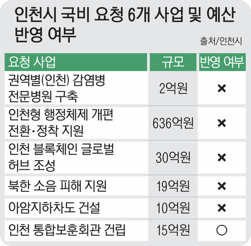 반면 인천시가 내년 국비를 요청한 사업 중 ‘권역별(인천) 감염병 전문병원 구축’(2억원), ‘인천형 행정체제 개편 전환·정착 지원’(636억원), ‘인천 블록체인 글로벌 허브 조성’(30억원), ‘북한 소음 피해 지원’(19억원), ‘아암지하차도 건설’(10억원) 등 5건은 정부 예산에서 최종 제외됐다.