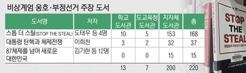 세부적으로 보면 윤 전 대통령의 변호인인 도태우 변호사가 필진으로 참여한 ‘스톱 더 스틸, 대법원의 부정선거 은폐 기록’이 총 168권으로 가장 많았다. 윤 전 대통령의 비상계엄 선포를 정당하다고 주장하는 내용의 ‘대통령 탄핵과 체제전쟁’ 37권, 전 한국사 강사 전한길씨 등이 필진으로 참여한 ‘87체제를 넘어 새로운 대한민국’은 15권이 도내 공립도서관에 비치돼 있었다. 220권 중 200권이 경기도서관 및 도내 시군이 운영하는 공립도서관(작은도서관 포함)에 있었으며, 과천·의정부 등 도교육청 도서관에도 7권, 초·중·고등학교도서관에도 13권이 있었다.