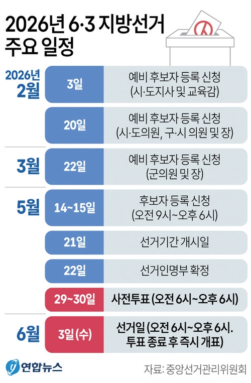 예비후보자 등록 신청은 시도지사, 교육감은 내년 2월3일(선거일 전 120일)부터, 시장·구청장과 광역·기초의원은 내년 2월20일(선거기간 개시일 전 90일)부터, 군수·군의원은 내년 3월22일(선거기간 개시일 전 60일)부터다.