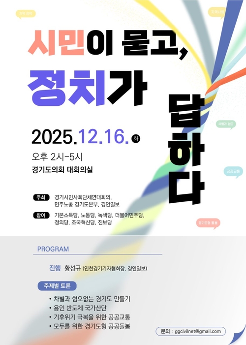내년 지방선거를 앞두고 지역 정치권에 주요 사회 의제에 대한 의견을 묻는 ‘시민이 묻고, 정치가 답하다’ 정책 토론회가 오는 16일 오후 2시, 경기도의회 대회의실에서 열린다.