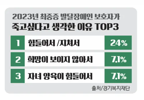 장애인의 돌봄 부담이 가정에 집중된 상황에서 보호자들의 우울감은 심각한 수준인 것으로 나타났다. 발달장애인 보호자 4명 중 1명(25.9%)이 ‘진지하게 죽고싶다고 생각한 적 있다’(경기복지재단 ‘2023년 최중증 발달장애인 24시간 돌봄 실태조사’ 자료)고 답했다. 보호자들의 우울 정도 역시 절반가량(41%)이 ‘심하다’고 느낀 것으로 조사됐다.