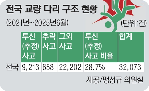 교량에 안전 난간 설치를 추진하는 이유는 투신 사고가 자주 발생하기 때문이다. 경인일보가 맹성규(민, 인천 남동구갑) 국회의원실로부터 입수한 ‘소방청 교량·다리 구조 현황’ 자료를 보면, 2021년부터 지난해 6월까지 전국 교량·다리에서 발생한 사고는 3만2천73건으로 이 중 28.7%(9천213건)가 투신으로 추정됐다. 같은 기간 지역별 교량·다리 사고에서 투신 추정 사고가 차지하는 비율은 대전 36.4%(88건), 대구 35%(162건), 서울 33.8%(6천872건), 인천 31.4%(124건) 순으로 높았다.