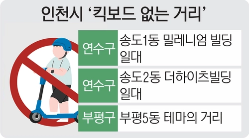 인천시는 보행자 안전사고를 예방하기 위해 연수구 송도국제도시 학원가 2곳(송도1동 밀레니엄 빌딩, 송도2동 더하이츠빌딩 일대), 부평구 테마의 거리 1곳을 ‘킥보드 없는 거리’로 지정했다.(1월6일자 6면 보도)
