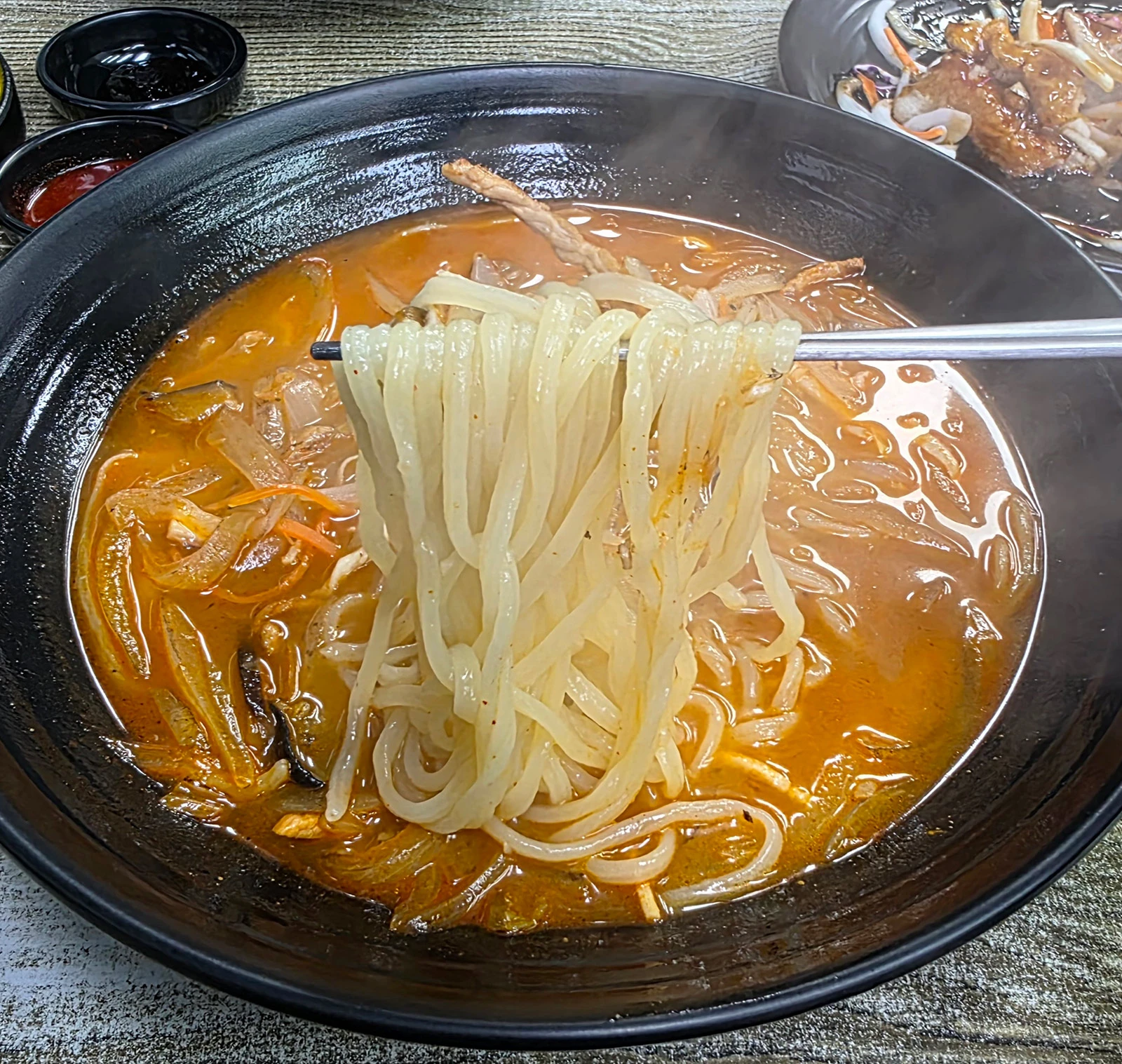 이런 계열의 짬뽕은 국물과 면이 겉돌 경우 심심한 채 끝날 수 있다. 하지만 이 집은 그 경계에서 절묘하게 살아남는다. 면발에도 적당히 간이 배어 있고 채 썬 양파와 당근에서 전해지는 달짝지근한 풍미도 국물에 녹아 있다. 채소 외에 버섯과 돼지고기, 오징어도 모두 새우깡 정도의 크기로 잘게 썰려 있어 먹기에 부담이 없다.