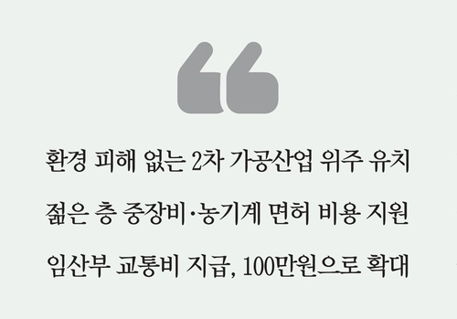 강화군은 또 청년과 신혼부부 지원도 확대하기로 했다. 박 군수는 “강화군이 서울 등지에 운영 중인 장학관에 입소하지 못한 대학생에게는 주거비를 지원해 학업에 전념할 수 있는 기반을 마련하고 신혼부부에게는 공공임대주택 임차료를 지원하고 임산부 교통비 지원도 100만 원으로 확대해 출산과 양육에 따른 부담을 줄여줄 계획”이라고 했다.