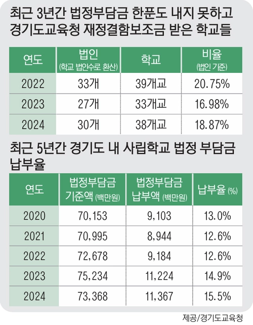 12일 경기도교육청에 따르면 지난 2022년 39개교(15.73%), 2023년 33개교(13.31%), 2024년 38개교(15.32%) 등 도내 사립학교(248개교)의 약 15% 정도가 법정부담금을 아예 내지 못하면서 재정결함보조금으로 학교를 운영했다.
