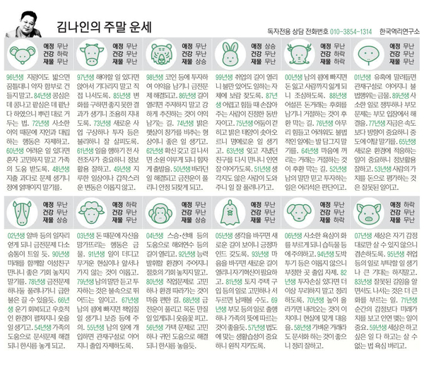 子(쥐띠)=96년 지렁이도 밟으면 꿈틀댄다 하였으니 약자 함부로 건들지 말고 84년 콩 심은데 콩 나고 팥 심은데 팥 난다 하였으니 뿌린 대로 거두는 법 72년 사소한 이익 때문에 지인과 대립하는 행동은 자제하고 60년 어려운 일 있다면 혼자 고민하지 말고 가족의 도움 받도록 48년 지출 과다로 금융문제 생기니 정에 얽매이지 말기를
