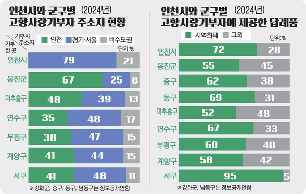 특히 기초단체인 인천 서구는 기부자에게 제공한 답례품 중 95.4%가 지역화폐인 ‘서로e음카드’였다. 동구도 답례품으로 지역화폐인 ‘동구사랑상품권’을 선택한 비율이 전체의 69.3%나 됐다. 연수구(67.4%), 부평구(59.9%), 계양구(58.2%)) 역시 답례품으로 지역화폐를 선택하는 기부자가 많았다.