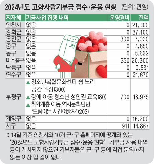 인천시와 10개 군·구 상당수는 고향사랑기부금 대부분을 곳간에 쌓아두고 있다. 사용처를 정하지 못해서다. 또 기부금을 활용해 사업을 벌인 일부 군·구들은 사용 내역이나 성과 등을 알리는 데 소홀하다는 지적도 나온다.