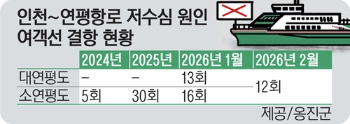 저수심으로 인한 여객선 결항은 지난해까지만 해도 소연평도에 한정됐다. 2024년 저수심으로 여객선이 소연평도에 기항하지 못했던 횟수는 5회였지만 지난해 30회로 급증했다. 저수심으로 기항지를 바꿔 대연평도를 먼저 들렀다가 다시 소연평도를 가는 횟수도 같은 기간 14회에서 38회로 증가했다.
