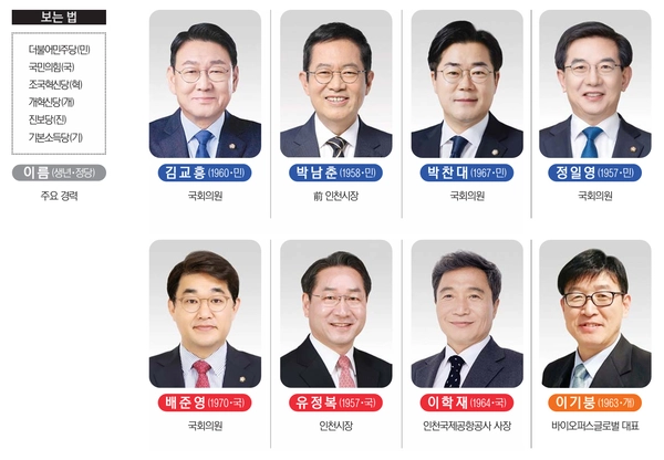 더불어민주당 후보군으로 현역 국회의원들과 전직 인천시장이 경합하고 있다.