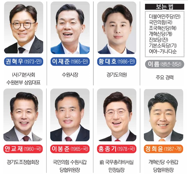 국민의힘은 아직 후보 정리 단계에 머물러 있다. 법조인 출신 홍종기 전 국무총리비서실 민정실장은 꾸준히 언급되는 인물로 과거 수원시장 경선 경험과 중앙정부·당 요직 이력을 갖췄다. 당협위원장 중에서는 이봉준 국민의힘 수원시갑 당협위원장이 후보군에 포함된다. 이 당협위원장은 언론인 출신으로 연합뉴스 모스크바 특파원 등을 지냈으며 수성고등학교 총동문회장을 맡아 지역에서 활동해왔다. 여기에 수원 유신고등학교 출신으로 경기도조정협회장을 맡고 있는 안교재 회장도 거론된다.