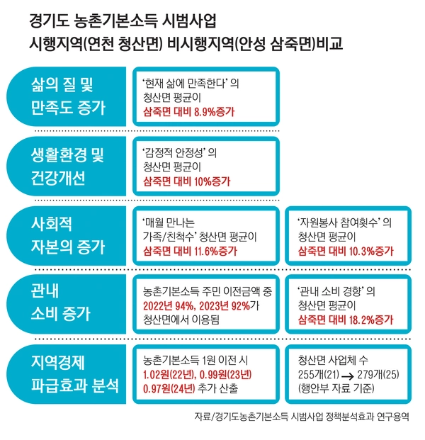 농어촌 기본소득은 인구 감소와 지역 소멸 위기에 처한 농어촌 주민들의 삶의 질을 높이기 위한 정책이다. 경기도가 지난해 9월 내놓은 ‘경기도 농촌기본소득 시범사업 정책효과분석 연구용역’에 따르면 연천 청산면과 비교지역으로 선정된 안성시 삼죽면과 비교해봤을 때, 삶의 질 및 만족도(8.9%)·생활환경 및 건강개선(10% 등)에서 긍정적 효과가 큰 것으로 확인됐다.
