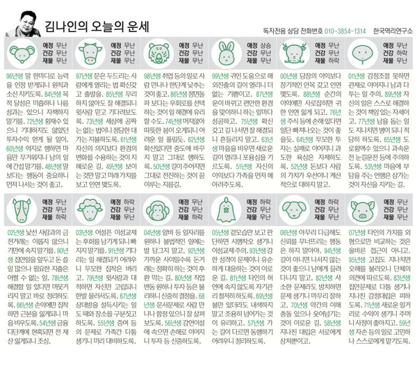 未(양띠)=03년생 어설픈 이성교제는 후회를 남기게 되니 너무 빠지지 말기를. 91년생 기다리는 일 해결되기 어려우니 무모한 집착은 버리도록. 79년생 윗사람과 대적하면 자신만 고립되니 한발 물러서도록. 67년생 상대방을 설득시키는 일도 때와 장소를 구분 짓고 하도록. 55년생 증여 등의 문제로 가족 간 다툼생기니 미리미리 대비하도록.