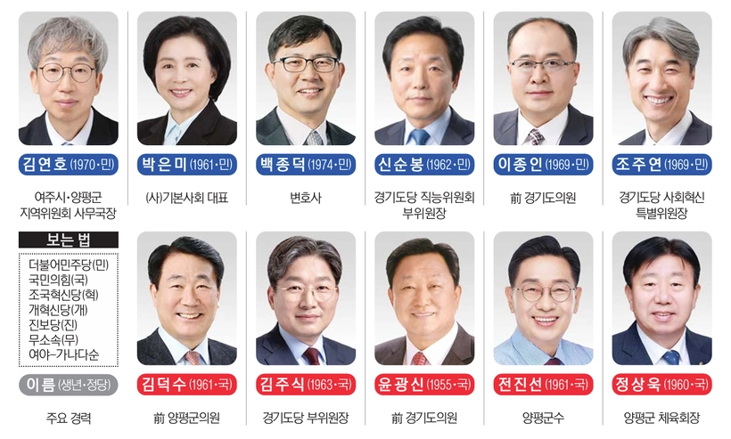 우선 국민의힘에서는 김덕수 전 양평군의원, 김주식 경기도당 부위원장, 윤광신 전 경기도의원, 전진선 현 군수, 정상욱 양평군체육회장 등이 채비를 하고 있다.